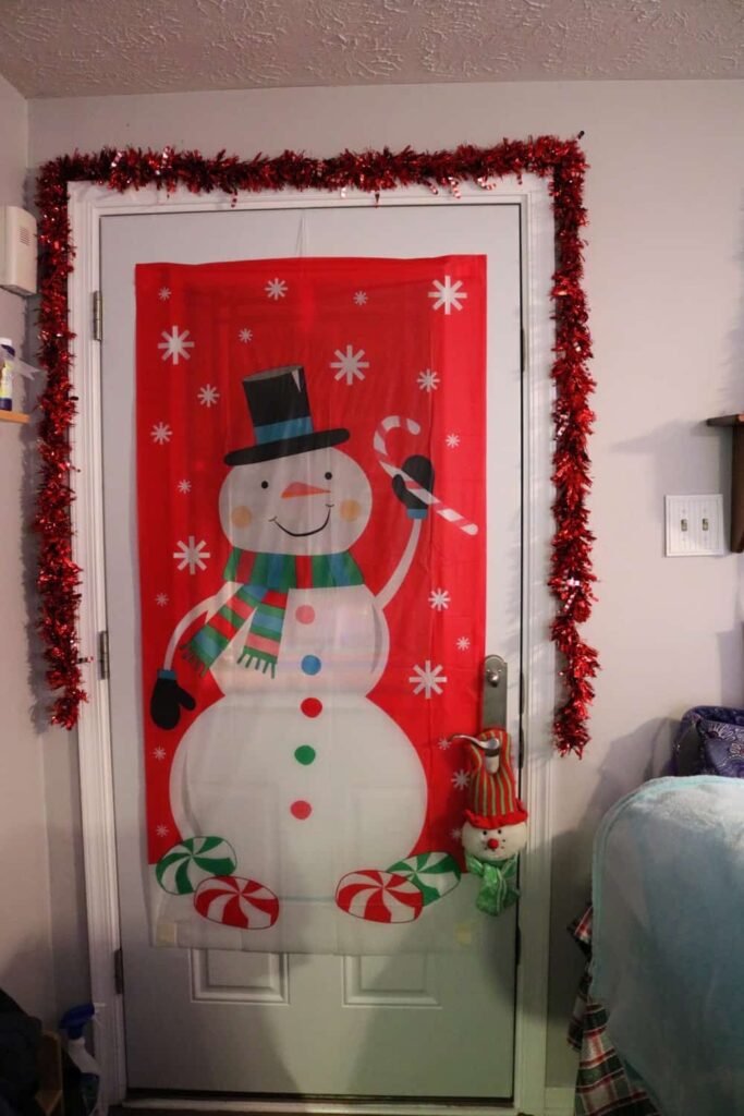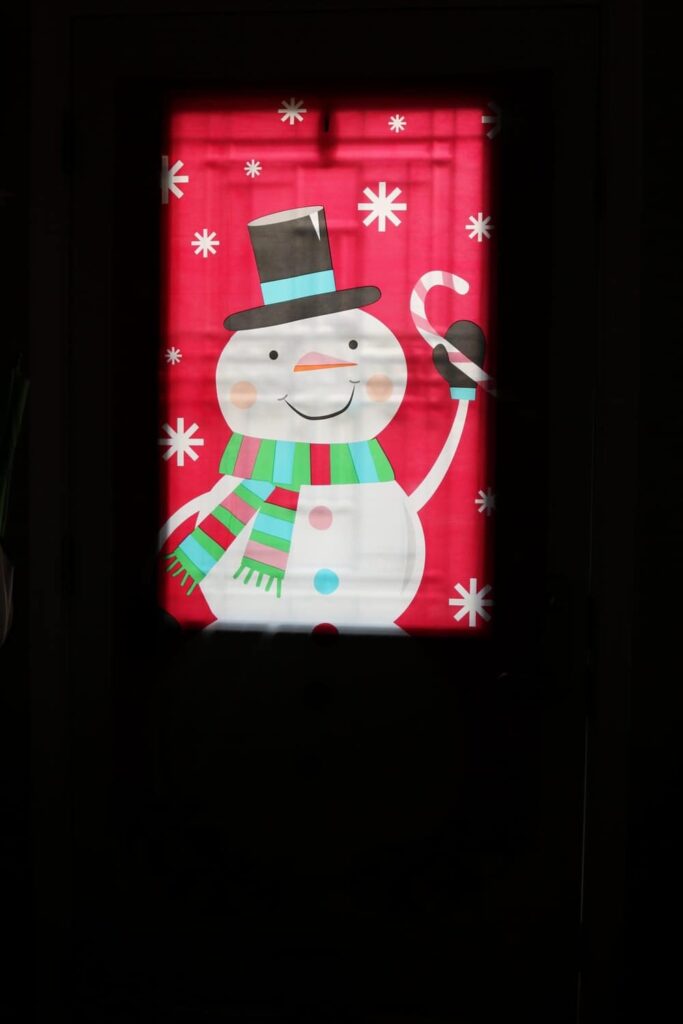 The last wall to see is this one that adjoins the Main Wall to the left. I found this snowman at the Dollar Tree. It is made of the same plastic the tablecloths are– just in a smaller shape made for a door.