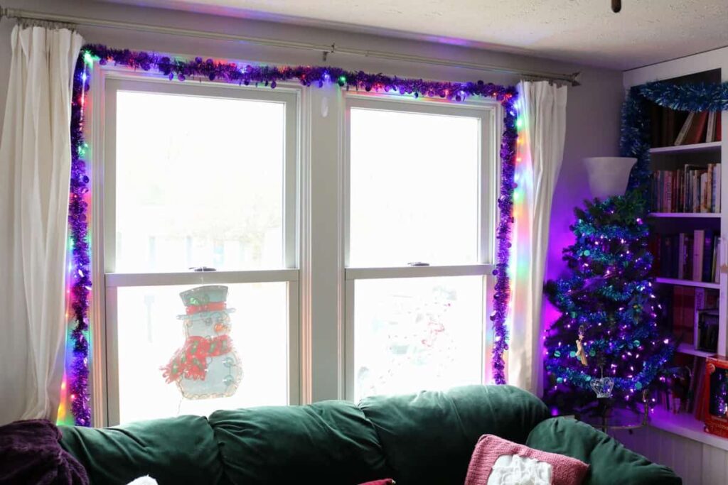 Here are the windows! I used purple garland and rainbow LED flat rope lights.* (Mine don’t have a remote control for changing colors– but these do.*) There are a snowman and a reindeer in the windows. They are facing outside, but you can still see a lot of them from inside.