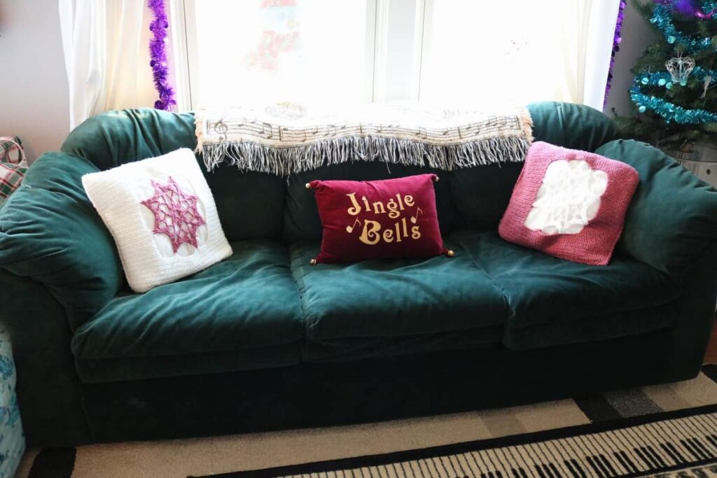 Our green couch finally fits in with Christmas colors, although I prefer it with the ivory colored blanket over it. The pillow has jingle bells on the corners– I bought it like that– but that is an easy thing that you could add to any pillow! I crocheted the two snowflake pillow covers years ago back when “rose” was popular.