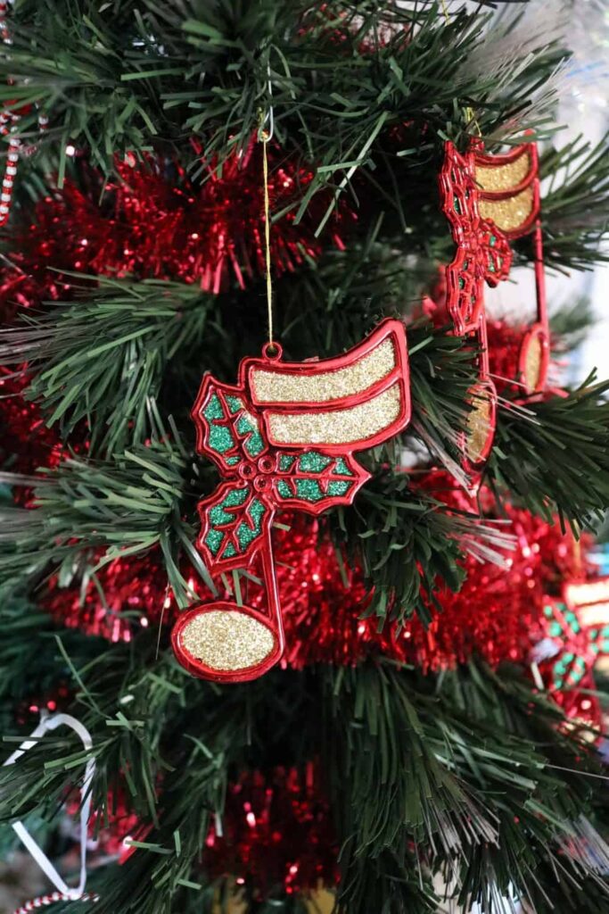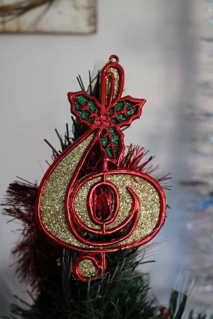 I decorated it with these plastic music ornaments that I found a long time ago. I don’t remember where. You can find other music ornaments here.*