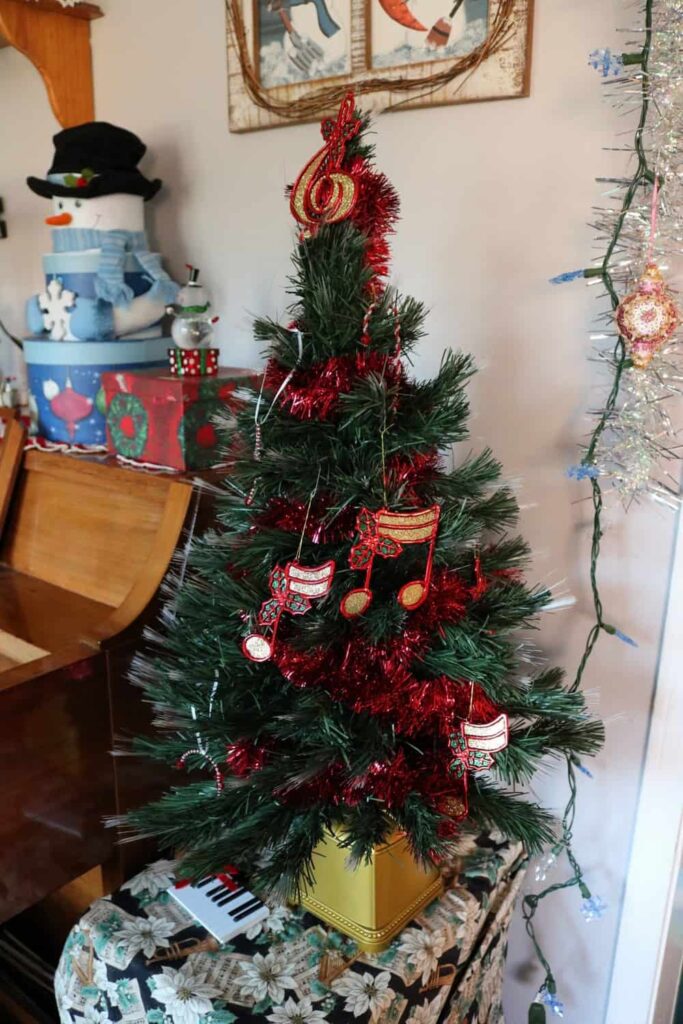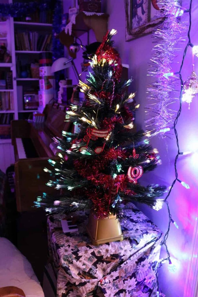 Beside the piano is a miniature fiber optic tree sitting on a table covered in music sheet and white poinsettia fabric. For around fifteen years, this is the only Christmas tree that I have had. You would think with all of those other ornaments that I would have a larger tree, but whenever I had room for a larger tree, I had very small children and thought that it wouldn’t be a good idea. So I have been content with this mini tree, and I’ve found other ways to display my ornaments, like hanging them on the garland and lights draped elsewhere.
