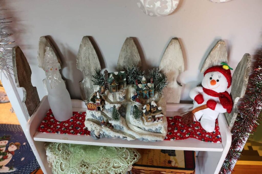 I made both of the green, red, and cream colored doilies years ago. A friend made the Angel cross stitch ornament to the left of the doily on the mirror. I painted the wooden snowman to the right of the doily. And of course, I created the Peppermint Chocolate Chip Shake Season printables, available here.