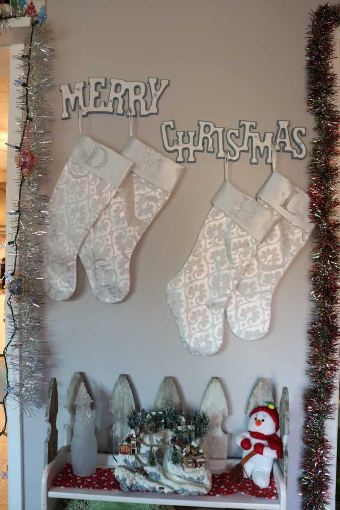 To the right of the doorway is where I put the stockings. I found the wooden Merry Christmas at a yard sale (I told you that was my decor style!) for a dollar or two, already painted! The two stockings to the left are hiding the thermostat.