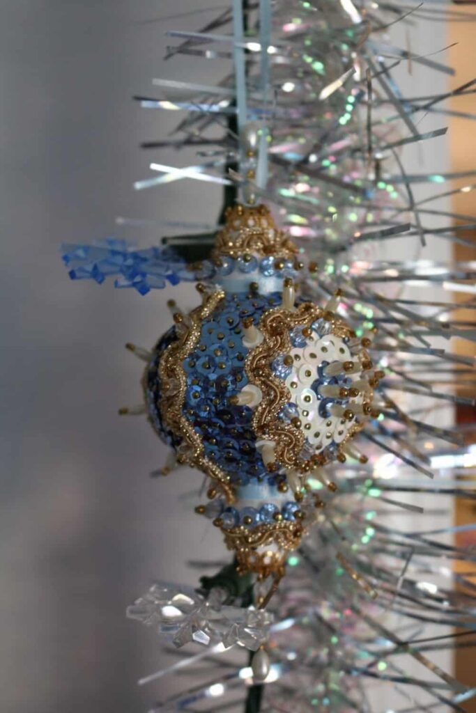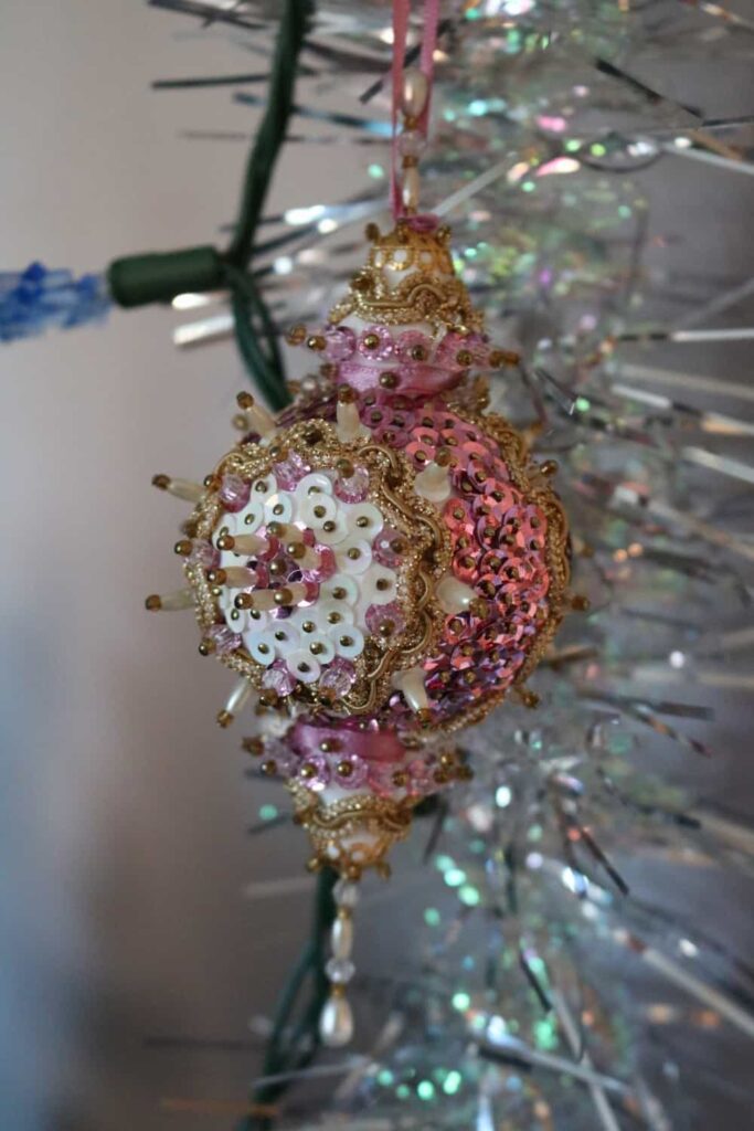 Hanging on the snowflake lights* and garland framing this doorway are these Victorian style ornaments that I made years ago from an ornament kit. You use a thimble to push the pins into a styrofoam ball. There is a pattern to follow for the sequins, beads, and ribbon.