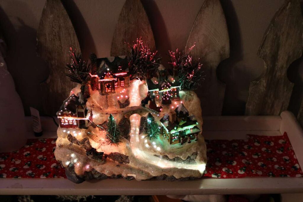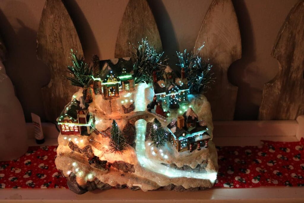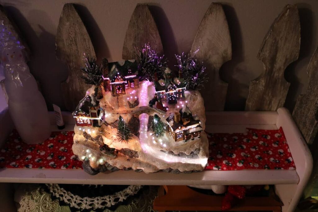The Christmas village lights up in different colors that change constantly, and is mesmerizing to watch.